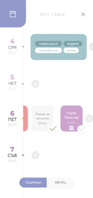 След раждането Feia продължава да бъде Вашият верен помощник. Модул "Родители" предлага инструменти за следене на растежа и графика за смяна на пелени, както и полезни статии за кърмене и хранене с адаптирано мляко. За спокоен сън на бебето ще намерите нежни приспивни песни, успокояваща музика и специален бял шум. Проследявайте развитието на детето си с контролни списъци за социални, когнитивни и физически умения до 12-месечна възраст. Разделът "За мама" е посветен на Вашето възстановяване и добро психическо здраве, включително упражнения на Кегел. Приложението предоставя и календар за задължителни прегледи и имунизации, насоки за първа помощ, списък за домашна аптечка и съвети за осигуряване на безопасна домашна среда за Вашето съкровище. Feia обединява цялото необходимо знание и практическа подкрепа за едно спокойно и щастливо родителство.