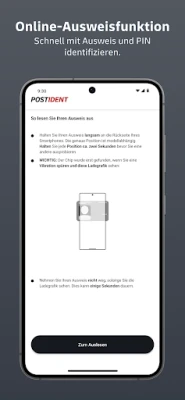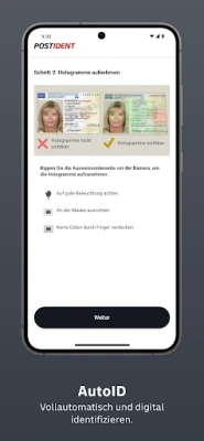 С POSTIDENT App извършвате идентификация бързо, лесно и сигурно директно от вашия смартфон. Вече няма нужда от сложни процедури. Приложението предлага удобно онлайн идентифициране по всяко време и навсякъде.
