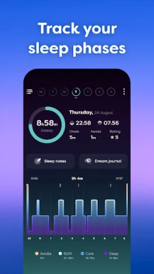 Оставете телефона си до леглото и позволете на Sleepwave да проследява съня ви безконтактно, предоставяйки ви подробен и лесен за разбиране анализ на фазите на съня, движенията през нощта и общия ви резултат за почивка. За да заспите по-лесно и да се събудите още по-приятно, Sleepwave предлага колекция от оригинални релаксиращи звуци и звукови пейзажи за нежно събуждане, както и възможност да създадете свои собствени уникални миксове от обширната звукова библиотека. Потопете се в специално създадени медитации за сън, които успокояват ума и тялото, гарантирайки дълбок и възстановяващ сън, или се отпуснете с "Wavescapes" – цветни модели и водни вълни, които освежават и фокусират съзнанието.