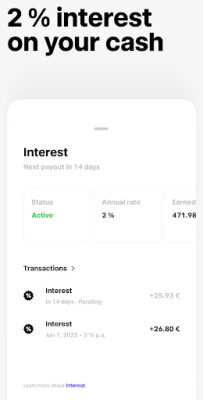 Открийте изцяло нов подход към управлението на вашите финанси, където парите ви работят за вас. С нашата иновативна платформа можете да се насладите на атрактивна годишна лихва от 2% върху неограничен паричен баланс, която се изплаща ежемесечно във вашата нова IBAN сметка. Насладете се на пълна гъвкавост да теглите средства по всяко време, без скрити месечни такси. Докато харчите, печелите – с безплатната карта получавате 1% кешбек (Saveback), който се насочва директно към вашия спестовен план, валиден за до 1500 евро месечни разходи. За да се възползвате от тази привилегия, е необходимо да инвестирате поне 50 евро месечно в спестовни планове. Освен това, закръглявайте всяко плащане с карта и инвестирайте спестените стотинки в движение, превръщайки всекидневните си покупки във възможност за растеж.